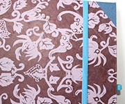 Es wurde von mir entworfen und handgearbeitet aus bedrucktem Loktapapier. Es ist mit Filmoplast eingebunden und hat innen auf der linken Seite ein Einsteckfach, z. B. für Scheckkarten oder Visitenkarten. Außerdem hat es ein Lesezeichen mit Acrylperlen.